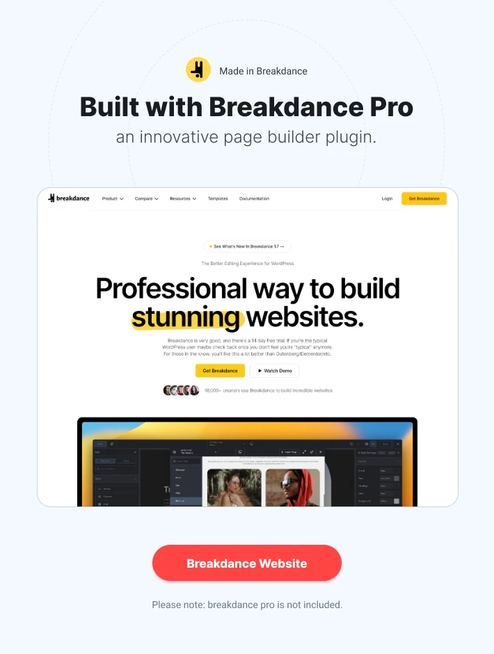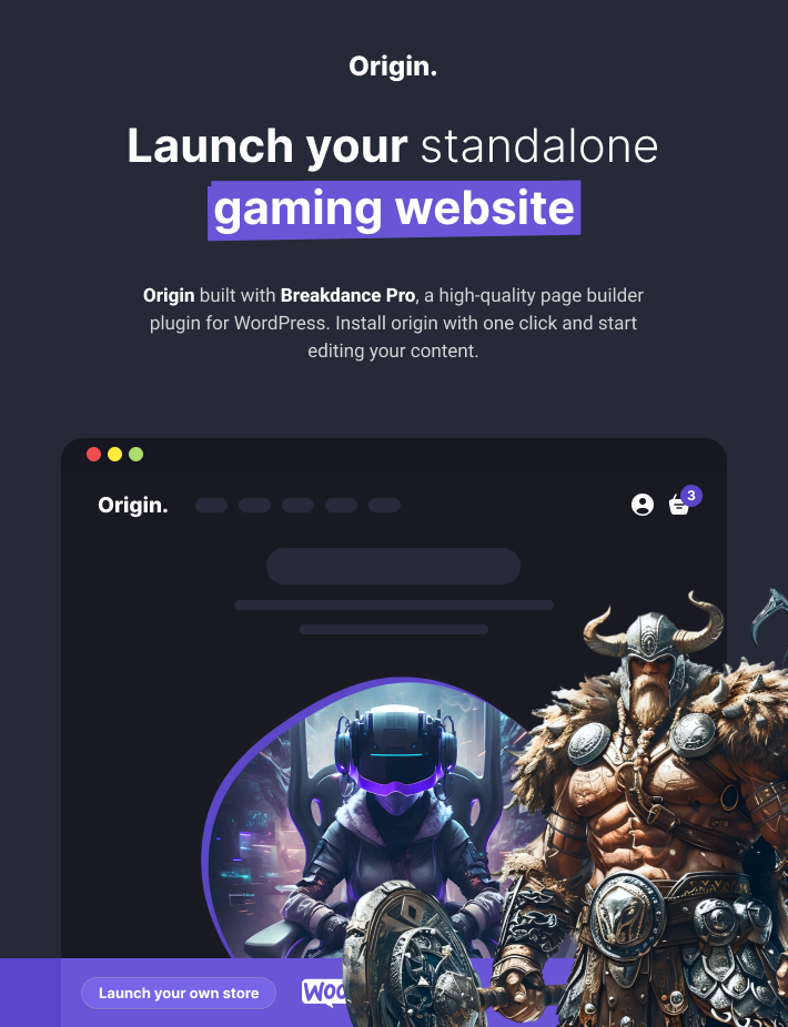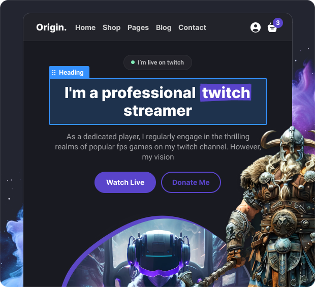 Origin is a premium WordPress theme for professional twitch streamers made with Breakdance page builder plugin (pro version). Please note: Breakdance page builder plugin is not included in downloadable files and requires pro subscription.